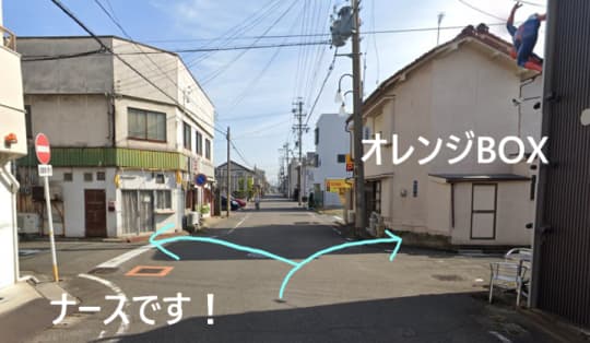 右側を見ていれば、オレンジBOXの看板が見えてきますよ!