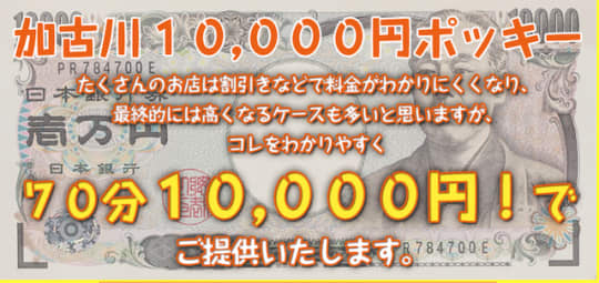「加古川10,000円ポッキー」のプレイ時間は、70分〜240分の設定。主なコースは、通常コース加古川限定・新規料金コース・ホテルパック・デートコースなど。無料のオプションもあるよ!