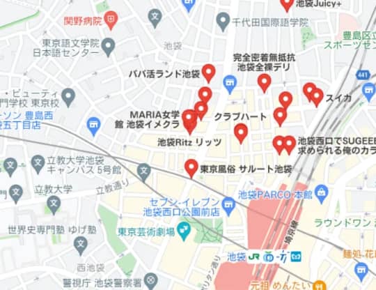 しかしその裏手には【池袋悶絶痴女】や【リンリンハウス】などの風俗店が点在しています。池袋西口は北側を中心として、各地に風俗店が点在していることも特徴です。