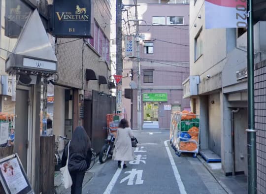 次に画像左の路地を真っすぐ、1つ目の十字路を過ぎ、突き当り手前まで進みます。