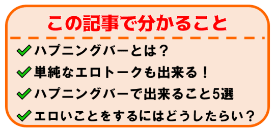 今回は、そんなハプニングバーでどんなエロいことができるのか、筆者の体験談、ハプニングバーでエロいことをするにはどうすればいいのか…など、初心者さん必見の内容を詰め込みました♡