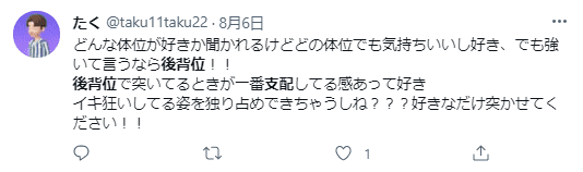 また、挿入中にお互いの密着度が高い体位も好みます。寝バックや座位、正常位なんかがそうですよね。