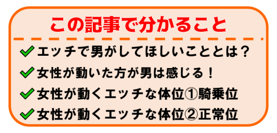 では、早速それぞれの騎乗位エッチでの男性を感じさせる動き方を解説します。